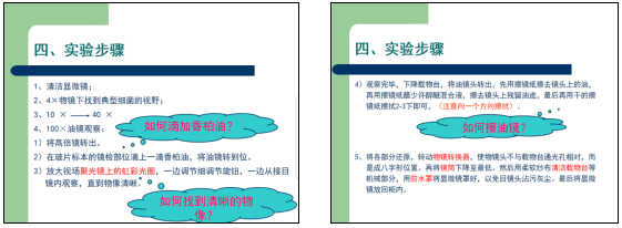 (3)新课讲授:主要讲解主要试剂的功能,并告知各种器材摆放的位置。按照ppt讲解实验步骤,强调三个问题:如何从低倍镜到高倍镜找到标本;如何使用油镜;如何清洁管理显微镜。学生听讲及思考,做好记录,回答教师群体互动提出的问题。