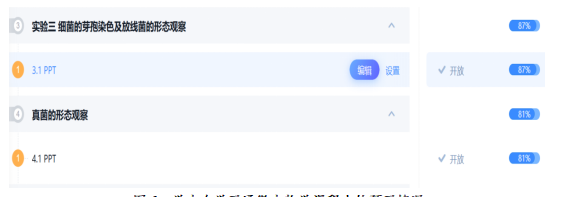 课前:让学生完成上一次实验课的实验报告内容,通知学生下一次课的实验内容并写好下一次实验课的预习报告。预习报告通过学习微生物学实验指导书相关的实验内容和微生物学实验学习通线上课程中的授课PPT再撰写,任课教师对预习报告的撰写质量做出点评,且督促学生做好预习报告。在上实验课前对上一次实验课的实验报告撰写质量做出点评,通过在PPT上展出优秀的作业案例,指出一些同学实验报告中存在的问题,分析问题产生的原因,并鼓励学生积极改进实验报告的撰写质量。对于上次作业的思考题部分给出任课教师的参考答案,鼓励学生按照参考答案修改订正自己的思考题答案。学生在学习通网站上的预习情况: