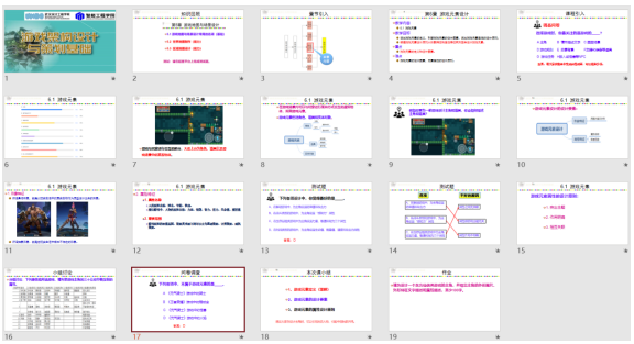 本课程采用PPT讲解,教学内容中概念较多,但鉴于学生有玩游戏的经历,采用问题导入和归纳总结的方式进行讲授,从市面上的常见的游戏出发,引导学生思考总结,然后给出概念,并以作业的方式检测学生对内容的理解。通过讲解游戏往年优秀游戏毕业设计作品,并分析游戏的关卡设计,引导学生将实际生活中的事情引入到游戏设计中,引导学生将保护环境和热爱生活理念融入到关卡的目标中,设计出具有教育意义的积极向上的关卡。